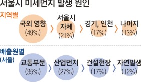 -레퍼 연구가 진행 중이라서 정확한 결과는 아니지만, 서울의 미세먼지는 중국 등 해외 영향 38~49%, 국내 타 지역 25~26%, 서울 자체 발생이 21~27%다. 서울의 배출 원인별로 분석하면 교통 31~52%, 비산먼지 12~48%, 난방·발전 16~27%다.