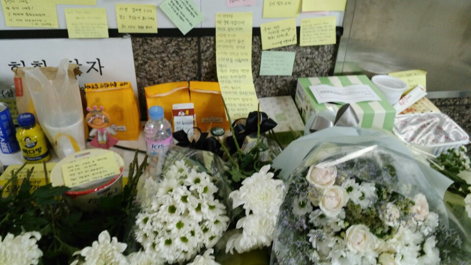 28일 구의역 스크린도어 정비를 하다 사망한 김모(19)씨를 위한 추모공간에 시민들의 발길이 이어지고 있다. 김씨가 작업을 하다 변을 당한 잠실방향 9-4번 플랫폼 스크린도어에는 수십 장의 추모글과 하얀 국화가 붙어 있다.