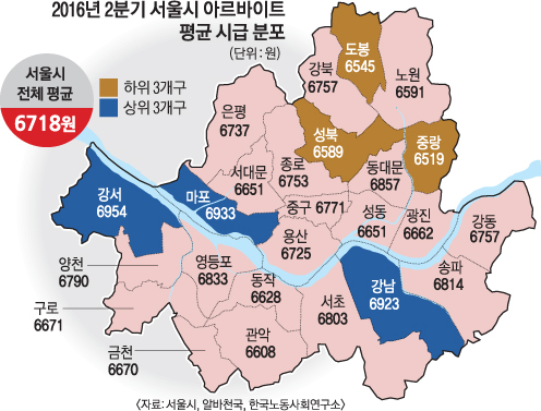 올 2분기 알바천국에 등록된 39만여건의 아르바이트 모집 공고를 분석한 결과 강북지역 시급은 6696원으로 서울 평균보다 22원 적었고, 강남지역은 6768원으로 평균보다 50원 많았다. 특히 강남, 서초, 송파 ‘강남 3구’의 평균 시급은 6850원으로 서울 평균보다 132원이나 많았다.