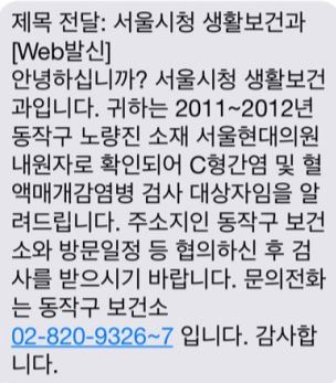 서울 시민 7800여명 등 전국 1만1306명에게 ‘보건소에서 C형간염 감염 검사를 받으라’는 공포의 문자폭탄이 서울시에서 25일 발송됐다.