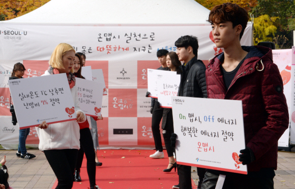 7일 서울광장에서 열린 옷을 따뜻하게 챙겨 입어 에너지를 아끼자는 ‘온(溫) 맵시’ 문화 확산 행사에서 모델학과 학생들이 온맵시 패션을 선보이고 있다.