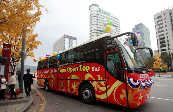 새로 도입된 서울시티투어 ‘하이데커 오픈탑’ 버스가 14일 서울 세종로 사거리 매표소 앞에서 출발하고 있다. 지붕을 열고 닫을 수 있는 이 버스는 여름에는 시야 방해 없이 서울 시내를 즐기고 겨울에는 따뜻한 실내에서 관광을 즐길 수 있다.
