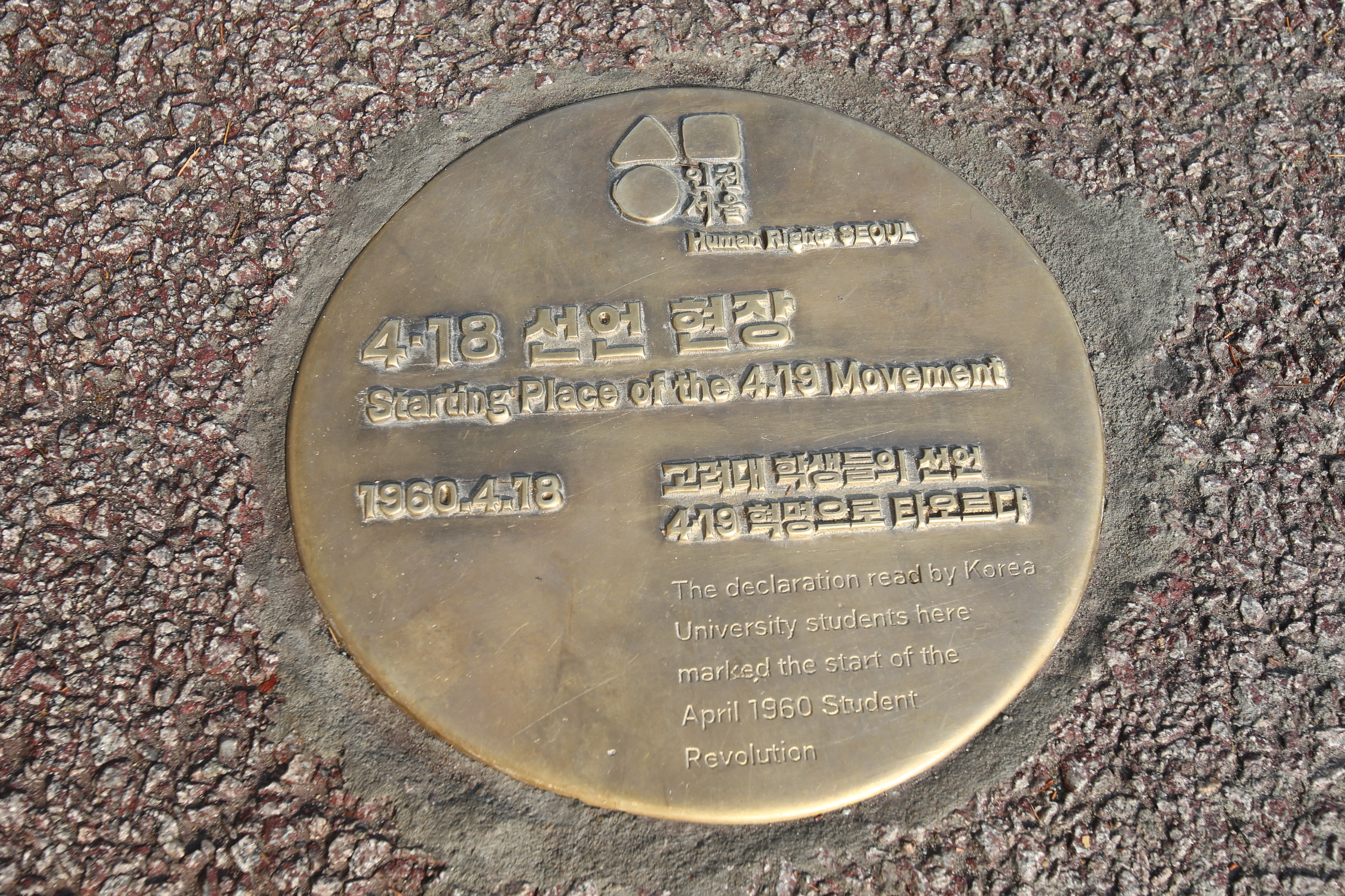 1960년 4.19혁명의 도화선이 된 ‘4.18 선언’이 있었던 안암동 현장에 설치된 인권현장 표지석.