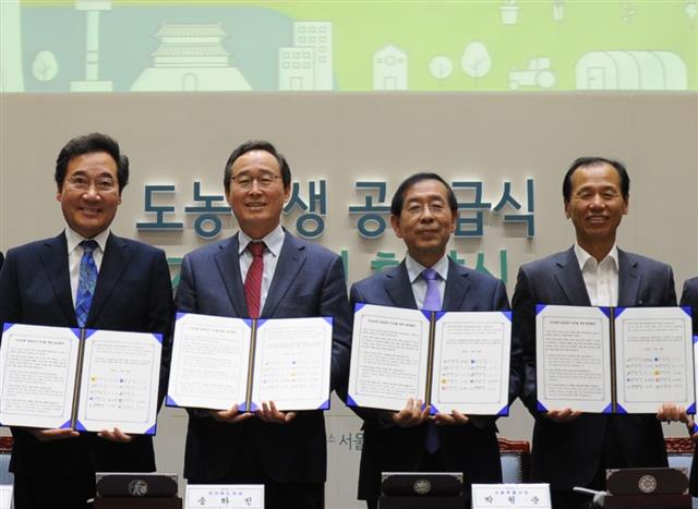 박원순(오른쪽 두 번째) 서울시장이 30일 오후 시청사에서 9개 광역지자체 대표와 도농상생 공공급식 지원사업 협약을 체결하고 있다. 시는 어린이집과 지역아동센터, 복지시설 등 공공급식시설에 친환경농산물 등 우수 식재료를 공급받기 위해 이날 협약을 맺었고 다른 지자체들은 농산물의 안정적 판로 확보를 기대하고 있다. 왼쪽부터 이낙연 전남도지사, 송하진 전북도지사, 박 시장, 최문순 강원도지사.