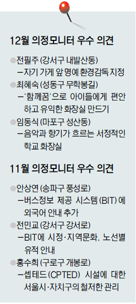 서울신문과 서울시의회가 함께 진행한 11·12월 의정모니터에서는 골목문화, 학교 화장실 개선 의견과 정보기술(IT)을 활용해 시민 삶의 질을 높이려는 아이디어들이 눈에 띄었다. 12월에는 총 78건의 제출 의견 중 심사를 거쳐 3건이 우수 의견으로 선정됐다.