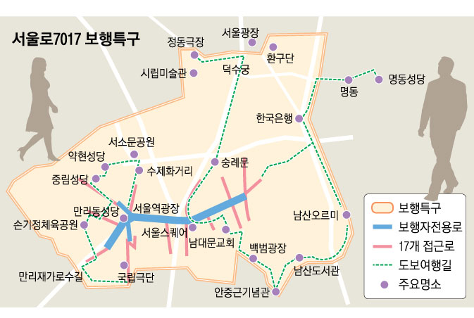 시는 서울로 7017을 중심으로 북쪽으로는 남대문로와 소공로, 서쪽으로는 충정로와 손기정로 등을 경계로 하는 만리동과 회현동 일대 1.7㎢를 보행환경 개선지구로 지정한다. 개선지구가 되면 보행자 장애물과 옥외광고물 등을 우선 정비해야 한다. 고원식 횡단보도(보도와 횡단보도 사이의 턱을 없애 평평하게 만든 것)와 차량 속도 저감시설, 교통신호기 등도 먼저 설치해 걷기 편한 환경을 만들 수 있다. 또 보행특구 안에 도보여행 길 5개 루트를 조성해 역사문화 콘텐츠와 어우러지는 관광 코스로 만든다.