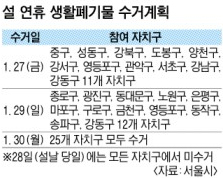 25일 시에 따르면 설 연휴 첫날인 27일에는 25개 자치구 중 중구 등 11개 구만 쓰레기를 거둬 가고 송파구 등 나머지 14개 자치구에서는 수거 업무를 하지 않는다. 또, 설 당일에는 모든 자치구에서 쓰레기를 수거해 가지 않고 29일에는 성동구 등 13개 구에서 수거하지 않는다. 수도권 매립지와 자원회수시설 등 폐기물처리시설이 명절을 맞아 쉬기 때문이다. 생활쓰레기와 음식물쓰레기 수거는 30일에 본격 재개되므로 29일 저녁부터 버리면 된다.