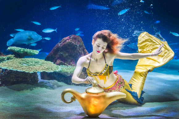 한화 아쿠아플라넷 63이 겨울방학을 맞아 8일 새롭게 공개한 수중 뮤지컬 ‘알라딘과 인어공주’의 한 장면으로 인어공주가 소원램프를 문지르고 있다. 한화 아쿠아플라넷 63은 1985년 설립돼 대한민국 아쿠아리움의 ‘원조’로 꼽힌다.