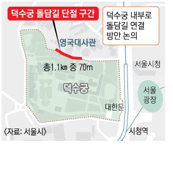 서울시와 문화재청이 연결되지 않은 덕수궁 돌담길 70m 구간을 완전히 연결하기로 했다.