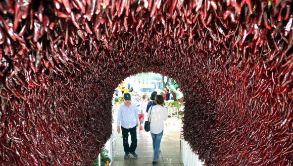 10일 서울 중구 서울시청 앞 광장에서 열린 ‘2018 영양고추 핫페스티벌’에서 시민들이 고추로 만든 터널을 지나고 있다.