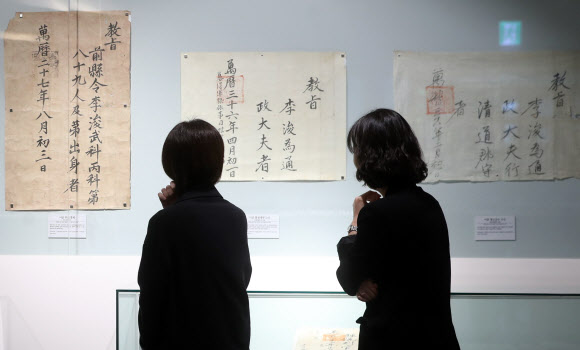 14일 서울 서초구 반포동 국립중앙도서관에서 열린 ‘회재 이언적, 독락당의 보물 서울 나들이’ 특별전 기자간담회에서 참석자들이 전시물을 살펴보고 있다. 조선시대 전기 문신인 이언적이 만든 경주 독락당이 대를 이어 가며 약 500년 동안 지킨 고문헌들이다.