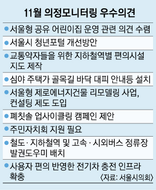 서울시의회는 지난 11월 의정모니터에 접수된 아이디어 96건 중 관악구 주민 류희춘 씨가 제안한 ‘서울형 공유어린이집 운영 관련 의견 수렴’ 등 14건을 우수의견으로 선정했다고 6일 밝혔다.