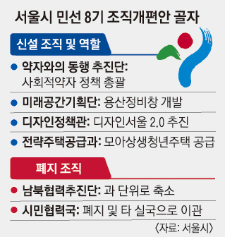 우선 시장 직속 정규 조직으로 신설되는 약자와의 동행 추진단은 취약계층 지원 정책의 컨트롤타워 역할을 한다. 저소득층, 독거노인 등 대상별로 지원 정책 방향을 정한다. 안심소득추진과, 주거안심지원반 등 오 시장의 1호 공약인 ‘취약계층 4대 정책’(생계·교육·주거·의료) 분야를 담당하는 부서도 각 실·국에 만들어진다.