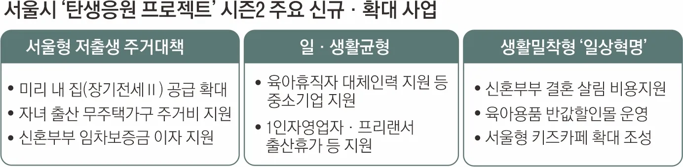 서울시는 이같은 내용을 골자로 한 ‘탄생응원 서울 프로젝트 시즌2’를 추진한다고 29일 밝혔다. 탄생응원 서울 프로젝트는 오세훈 서울시장이 2022년 발표한 ‘엄마아빠 행복 프로젝트’를 업그레이드한 정책으로, 출산·육아와 더불어 주거대책, 일·생활 균형 문제까지 포괄하고 있다. 서울시는 이번 대책을 위해 ▲서울형 저출생 주거대책 ▲일·생활 균형 ▲양육자 생활밀착형 ‘일상혁명’ 등 3대 분야의 10개 핵심사업에 향후 2년간 총 6조 7000억원을 투자한다.
