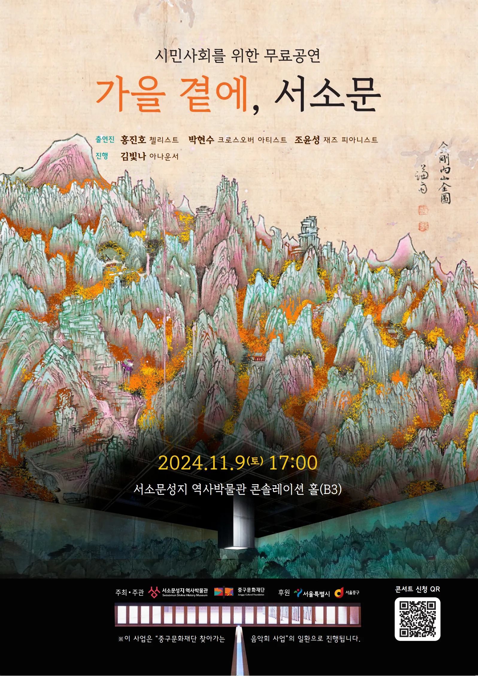 서소문성지 역사박물관이 주최하고 중구문화재단이 주관하는 이번 음악회는 깊어가는 가을 저녁 첼리스트 홍진호, 크로스오버 아티스트 박현수, 재즈 피아니스트 조윤성이 클래식, 팝, 영화음악으로 구민들에게 감동을 선사할 예정이다.