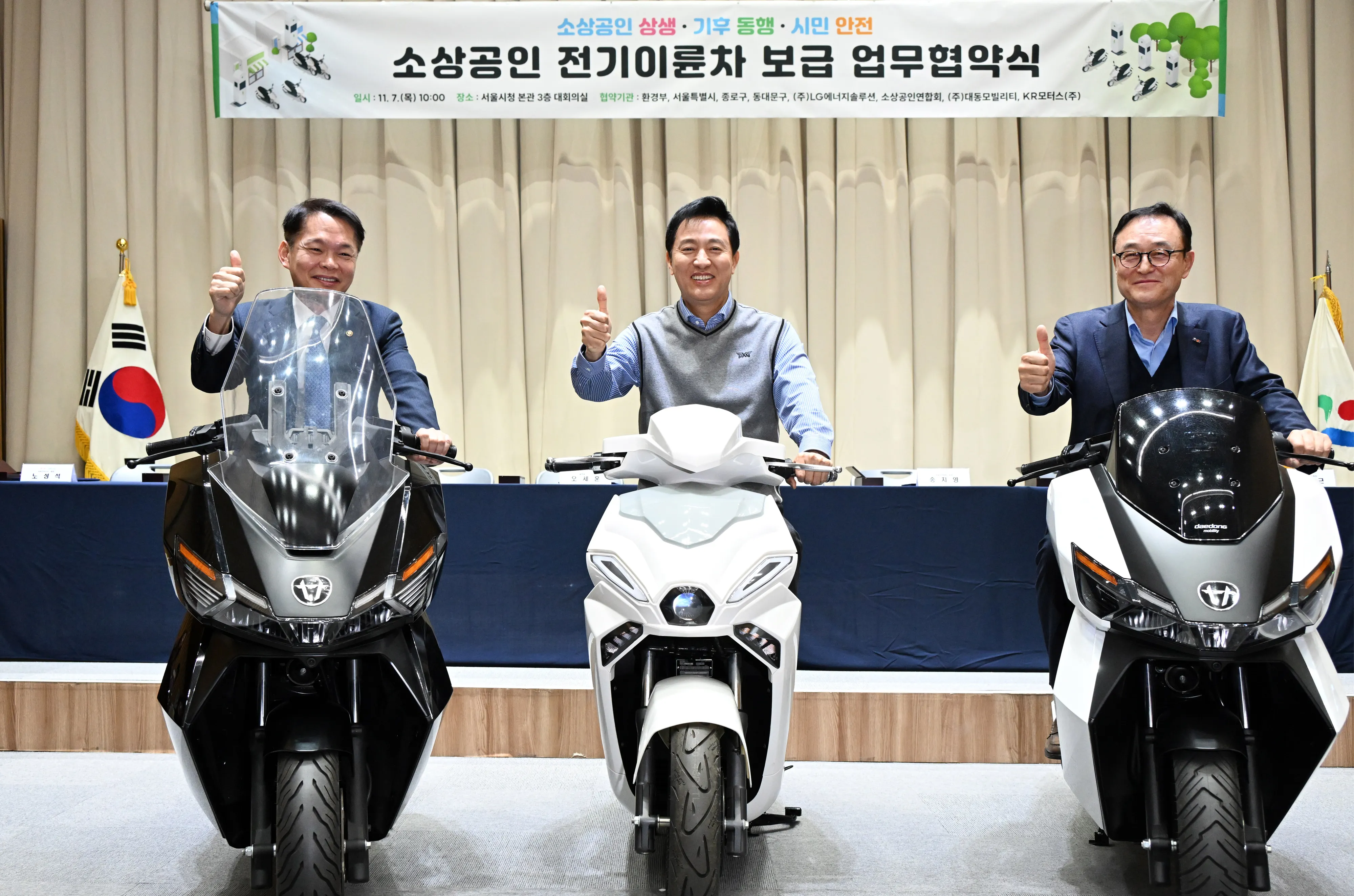 서울시는 7일 시청에서 ‘소상공인 전기이륜차 보급 확대 업무 협약식’을 진행했다. 행사에는 오세훈 서울시장과 이병화 환경부 차관을 비롯해 종로·동대문구, 소상공인연합회, LG에너지솔루션, 대동모빌리티, KR모터스 등 8개 기관 대표와 소상공인들이 참석했다.