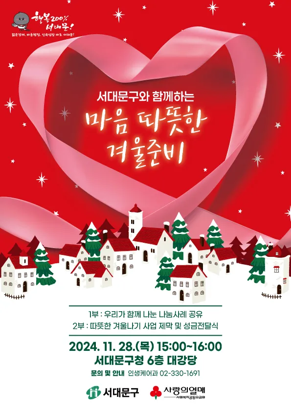 이성헌 서대문구청장은 “힘든 시기지만 주민 모두 따뜻한 겨울을 보낼 수 있도록 많은 분들의 관심과 참여를 부탁드린다”고 말했다.