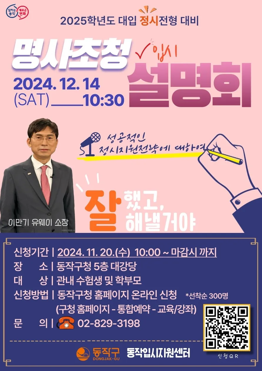 서울 동작구는 2025학년도 수능을 마친 수험생들을 위해 다음 달 14일 구청 대강당에서 ‘정시전형 대비 명사초청 입시설명회’를 개최한다고 20일 밝혔다.