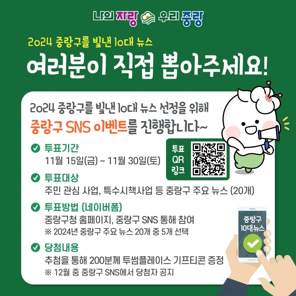 류경기 구청장은 “올해도 중랑구는 구민들을 위한 다양한 정책과 사업을 추진하며 많은 성과를 거두었다. 구민들께서 직접 선정한 10대 뉴스를 통해 한 해를 되돌아보고, 내년에는 더 나은 중랑구를 만들어가기 위한 발판으로 삼겠다. 많은 관심과 참여를 부탁드린다”고 밝혔다.