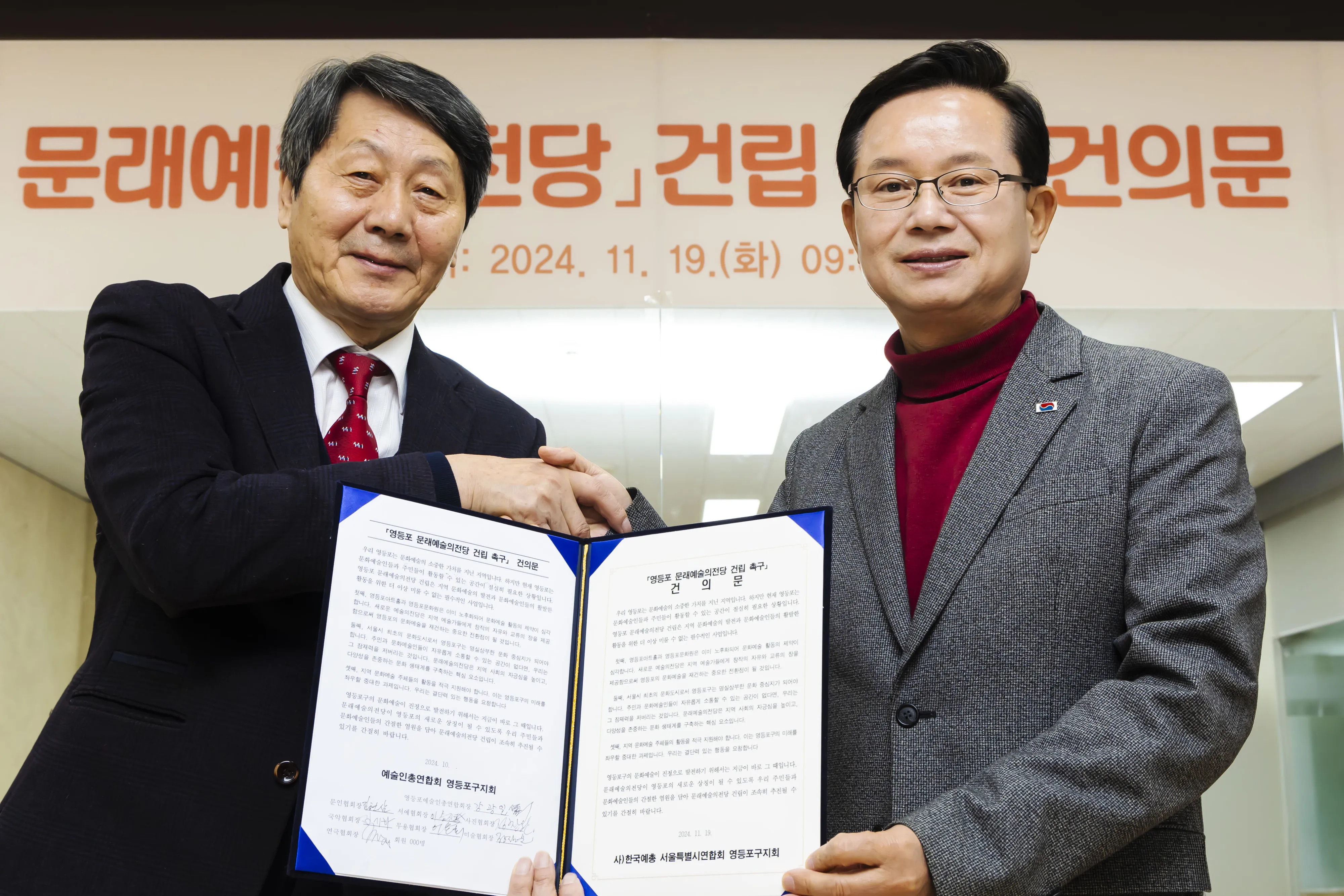 최호권(오른쪽) 서울 영등포구청장이 ‘영등포 문래 예술의전당 건립 촉구 건의문’을 받고 있다. 영등포구 제공