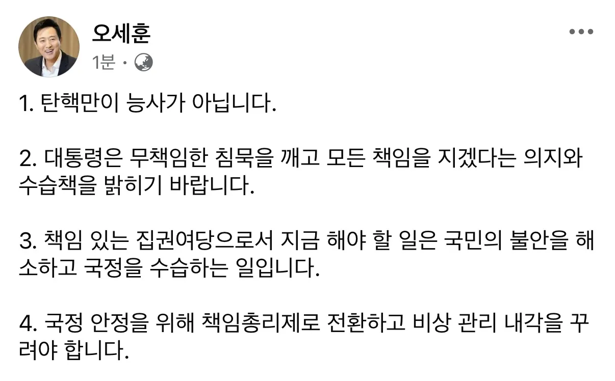윤석열 대통령의 계엄 후폭풍이 정국을 강타한 가운데 오세훈 서울시장이 “탄핵이 능사는 아니다”라며 책임총리제 전환이 필요하다고 주장했다.