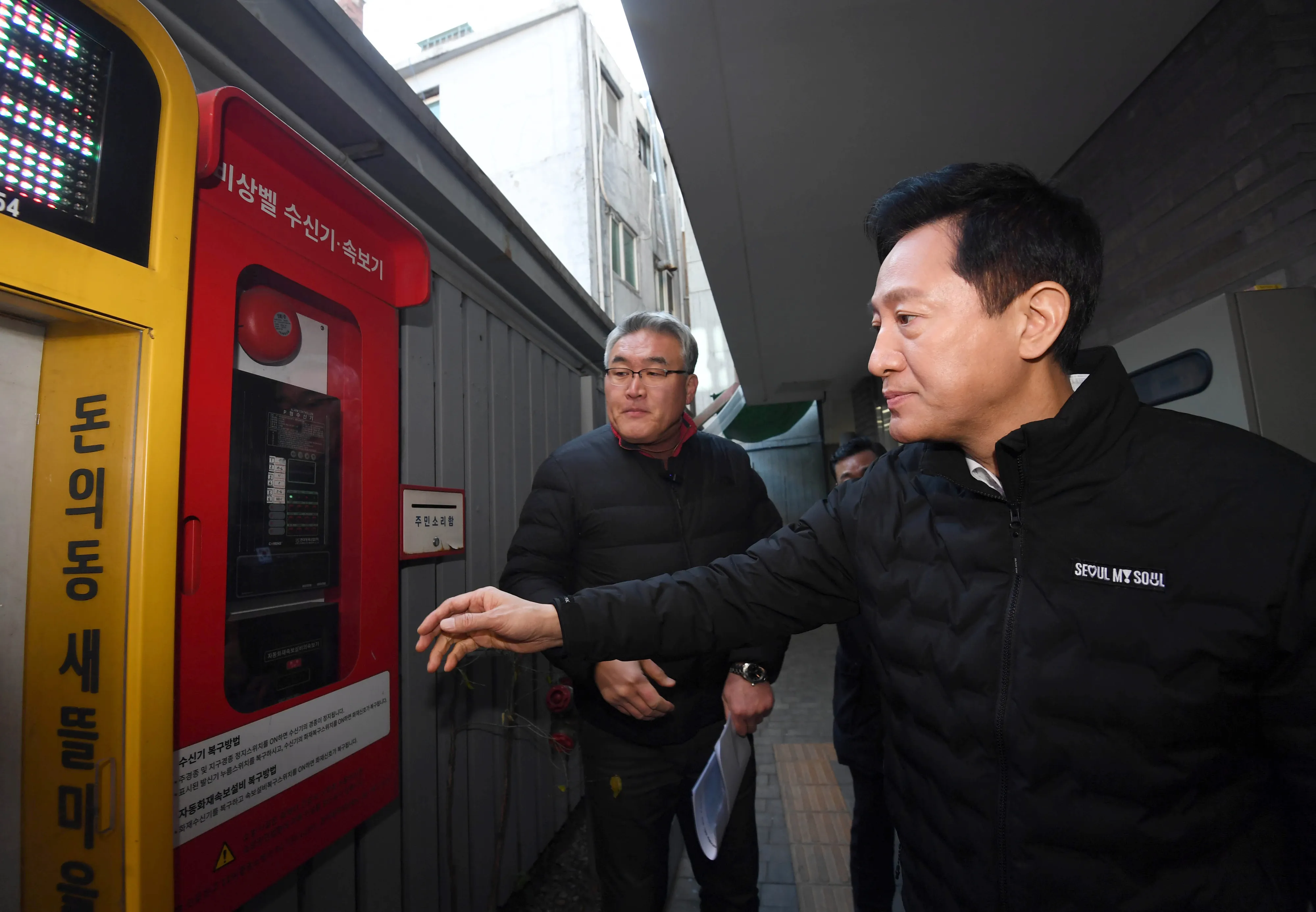 한파 대비 쪽방촌 현장 점검에 나선 오세훈(오른쪽) 서울시장이 18일 서울 종로구 돈의동 쪽방촌에서 비상벨 수신기·속보기를 살펴보고 있다. 연합뉴스