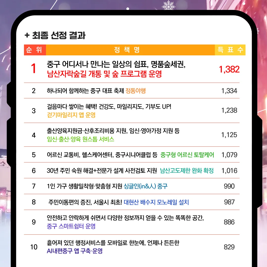 이밖에 주민들의 30년 숙원을 해결한 ‘남산고도제한 완화 사업’(1016표), 1인 가구의 소통과 힐링을 돕는‘싱글인 중구’(990표), 서울 최초 모노레일인 ‘대현산 배수지 모노레일’(987표)도 구민의 선택을 받았다.
