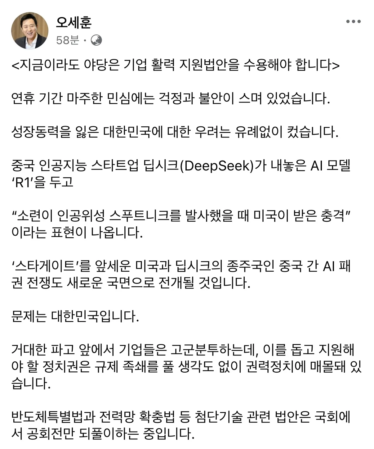 그는 “연휴 기간 마주한 민심에는 걱정과 불안이 스며 있었다. 성장동력을 잃은 대한민국에 대한 우려는 유례없이 컸다. 중국 인공지능 스타트업 딥시크가 내놓은 AI(인공지능) 모델 ‘R1’을 두고 ‘소련이 인공위성 스푸트니크를 발사했을 때 미국이 받은 충격’이라는 표현이 나온다. ‘스타게이트’를 앞세운 미국과 딥시크의 종주국인 중국 간 AI 패권 전쟁도 새로운 국면으로 전개될 것”이라면서 “문제는 대한민국”이라고 썼다.