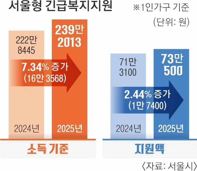 시는 2025년도 기준중위소득이 인상됨에 따라 서울형 긴급복지지원의 소득 기준을 완화했다. 지난해 1인가구 소득 기준은 222만 8445원이었다. 이것을 올해 239만 2013원으로 7.3% 올렸다. 4인 가구의 경우 572만 9913원에서 609만 7773원으로 6.4% 상향했다.