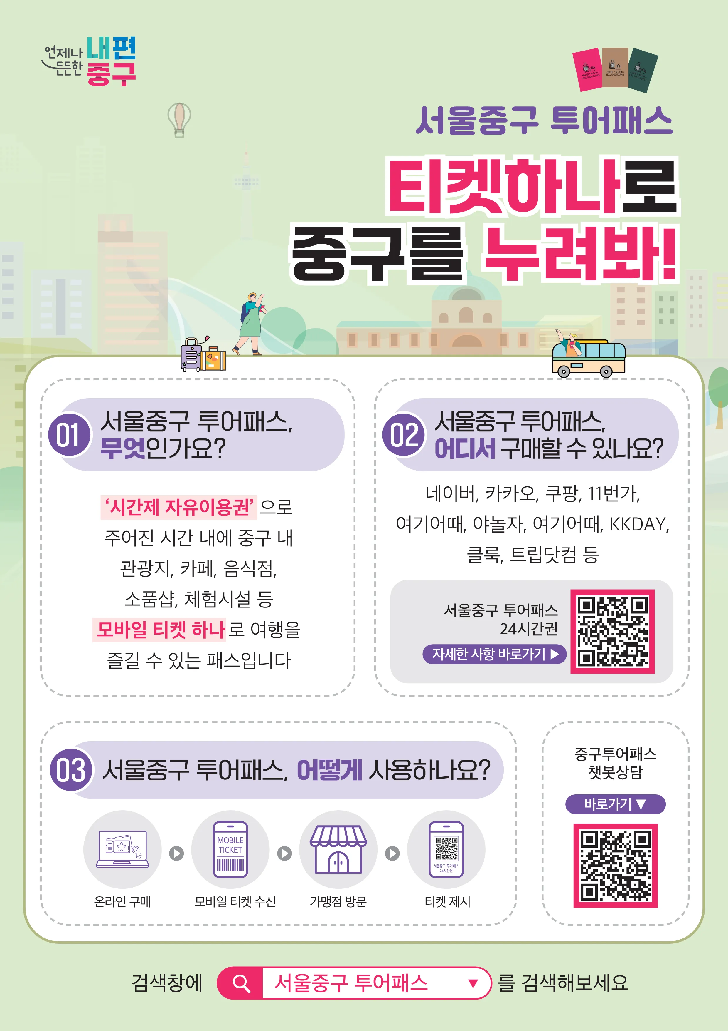 김길성 중구청장은 “시 자치구 중 최초로 투어패스를 정식 출시하게 돼 매우 뜻깊다”라며 “관광객들에게 편리하고 풍성한 여행 경험을 제공하는 것은 물론, 지역 경제에도 활력을 불어넣는 계기가 될 것”이라고 기대했다.