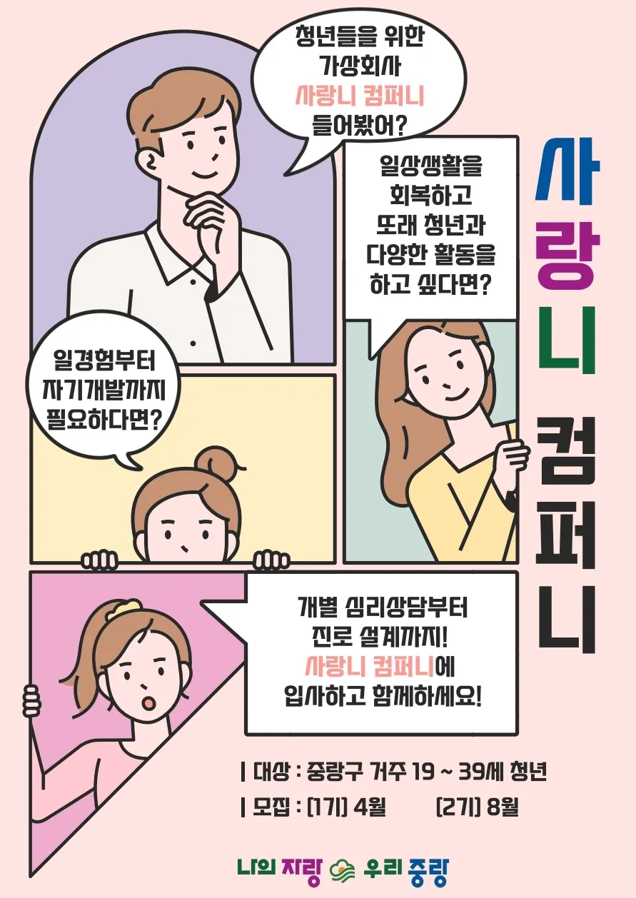 ‘사랑니 컴퍼니’란 ‘사회로 돌아오랑, 중랑 니트청년’의 줄임말이다. 사회 진입 과정에서 어려움을 겪는 청년들에게 손 내미는 회사라는 의미를 담고 있다. 중랑구는 이 사업을 통해 고립·은둔·니트 청년들의 일상 회복을 돕고 또래와의 지속적 교류를 통해 사회로의 복귀를 지원한다.