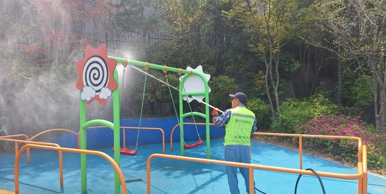 서울 동작구가 어린이와 부모가 안심하고 어린이공원을 이용할 수 있도록 대대적인 물청소를 했다고 16일 밝혔다.