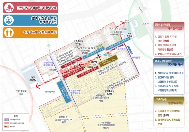 도시재생 활성화 계획은 시장 중심의 지역 활력 창출, 주거환경 개선 등을 핵심으로 총 8개 세부 사업으로 나뉜다. 이 가운데 보행환경과 상점 간판을 개선하는 등 5개 사업은 이미 시행됐다. 시장 현대화, 고객 주차장 건립, 유니버설 디자인 적용 등도 추진됐다.
