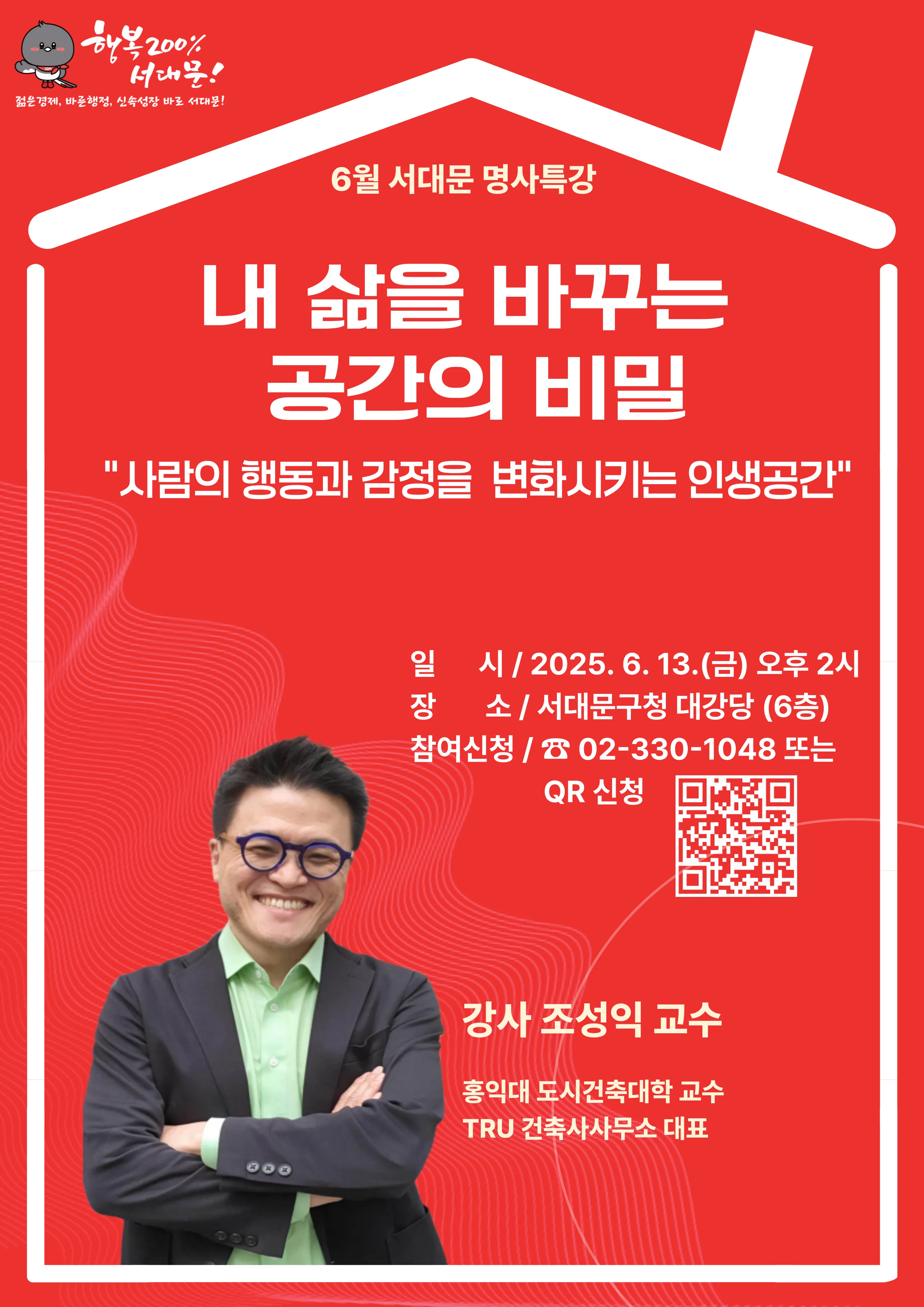 이성헌 서대문구청장은 “이번 특강이 개인의 공간을 돌아보고 삶의 변화를 그려볼 수 있게 하는 의미 있는 시간이 되길 바란다”고 말했다.