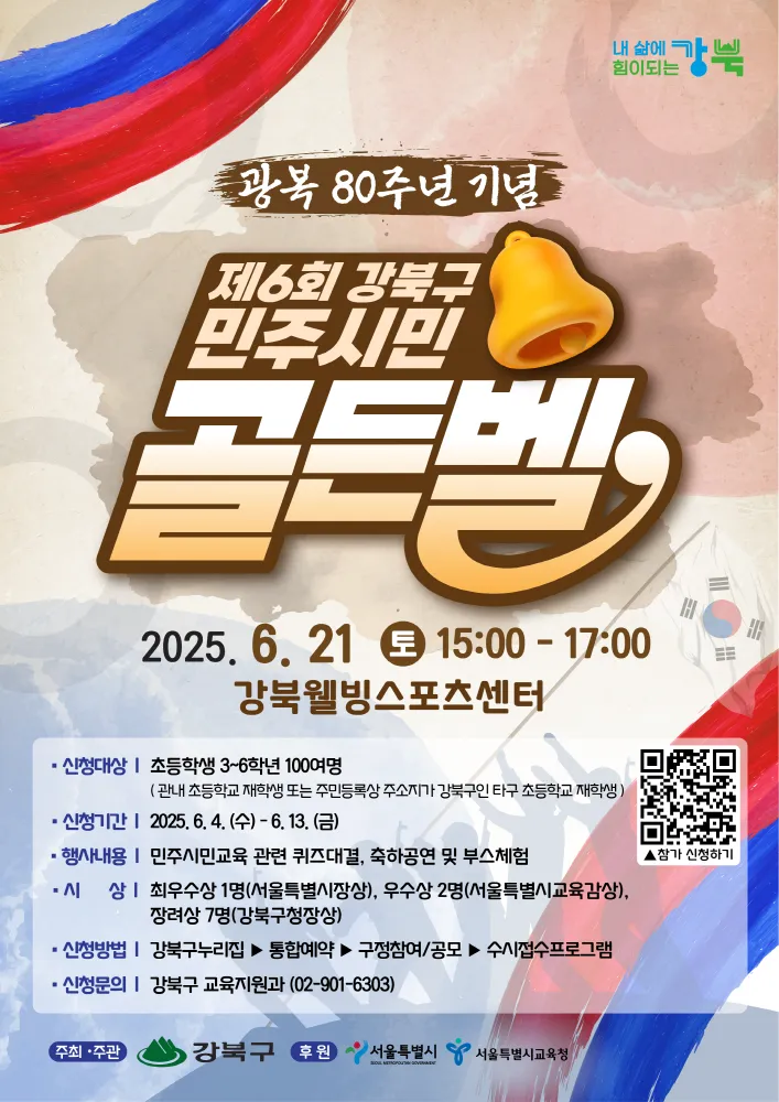 강북웰빙스포츠센터 종합체육관에서 열리는 이번 행사는 광복 80주년을 맞아 미래 세대인 어린이들이 대한민국의 역사와 민주주의의 의미를 되새길 수 있도록 돕자는 취지로 마련됐다.