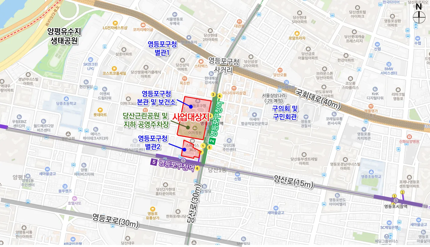 또한 구는 구청과 구의회 부지에 공개공지 조성을 통해 지하철 2·5호선 영등포구청역과 당산근린공원을 연결하는 보행 네트워크를 구축할 예정이다. 신청사 인근 도로 확장과 통행 체계 재정비, 보행로 설치 등을 통해 차량 흐름과 보행 안전도 확보한다.