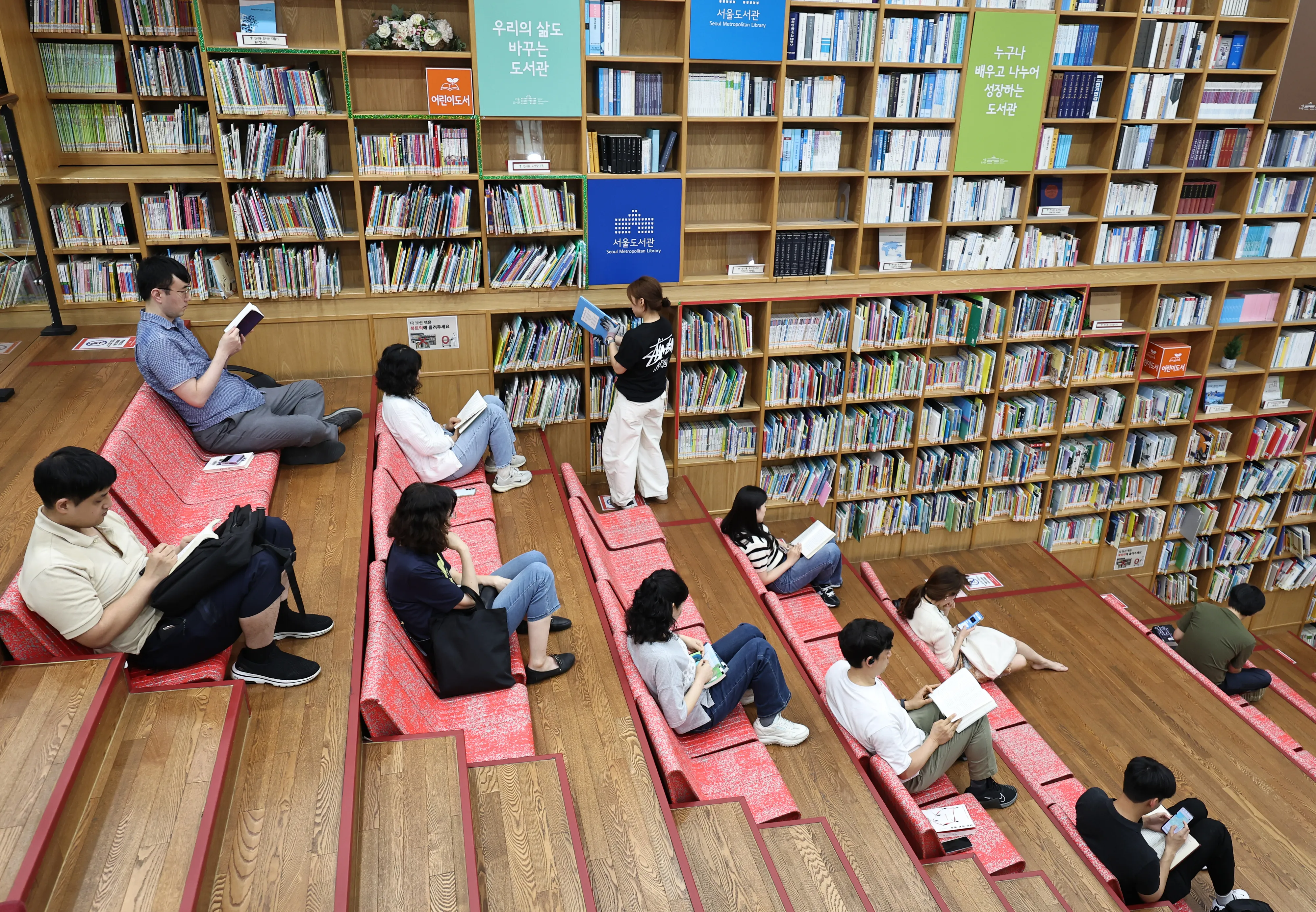 서울 전역을 비롯해 전국에 폭염특보가 발효된 3일 서울도서관에서 시민들이 불볕더위를 피해 책을 읽고 있다. 이날 일부 지역에선 낮 최고 기온이 36도까지 오르는 등 무더위가 계속됐다. 뉴스1