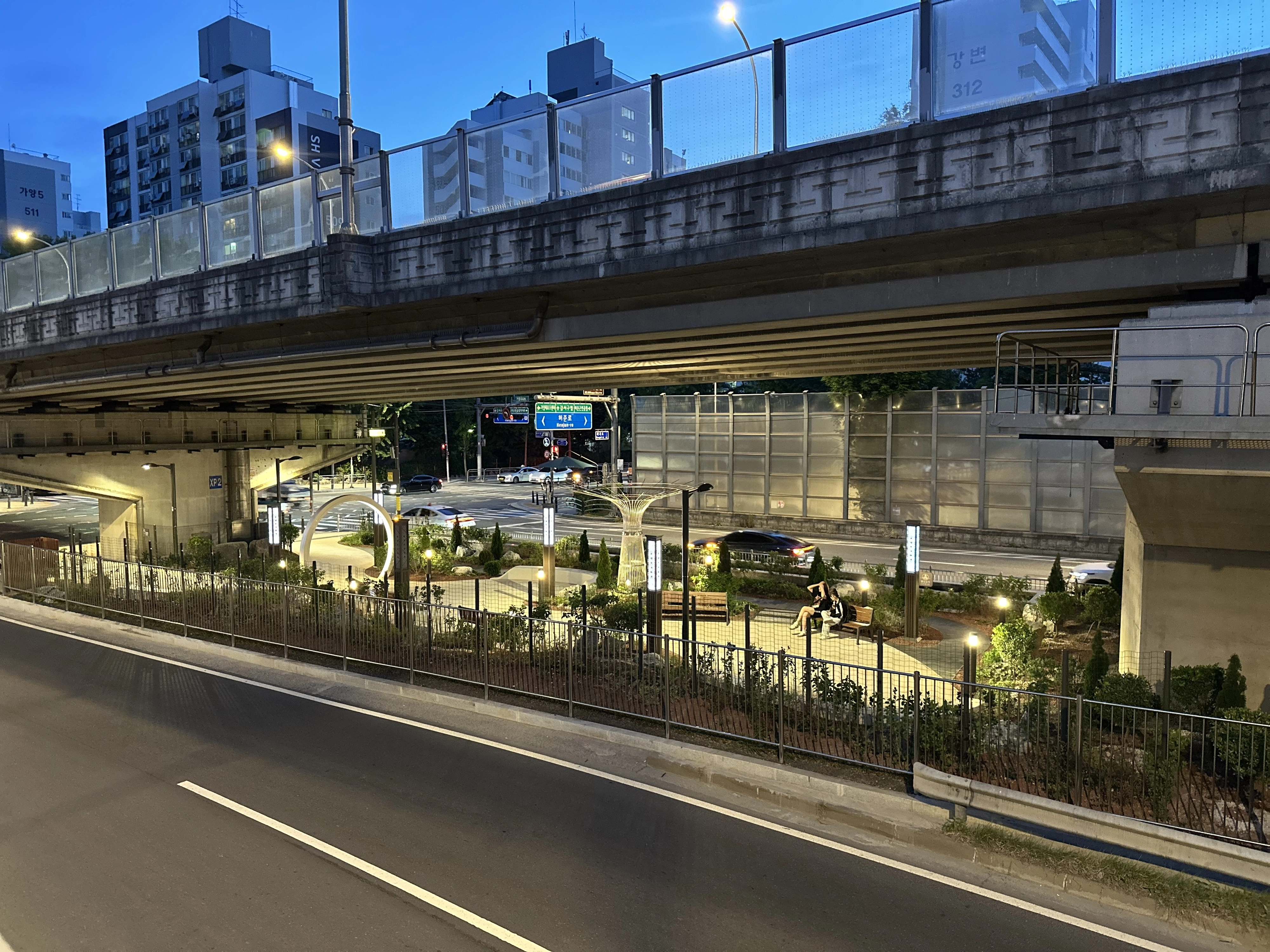 가양대교 남단 하부는 서울둘레길과 한강자전거길 이용자가 쉬어갈 수 있도록 수목과 조형 트렐리스, 분수, 안개 분사 기둥(미스트열주) 등을 설치했다. 노원역 철도고가 하부는 기존의 도로 중앙분리대를 철거하고, 대신 플랜터 화단 29개를 조성해 단절됐던 녹지 축을 자연스럽게 연결했다.