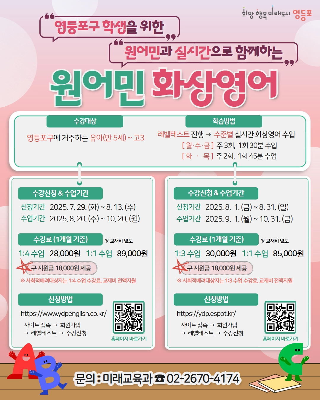 최호권 영등포구청장은 “더 많은 아동과 청소년이 수준별 맞춤 원어민 수업으로 영어 실력이 늘어나길 바란다”라며 “앞으로도 외국어에 대한 자신감과 글로벌 역량을 높이는 교육 프로그램을 확대하겠다”고 강조했다.