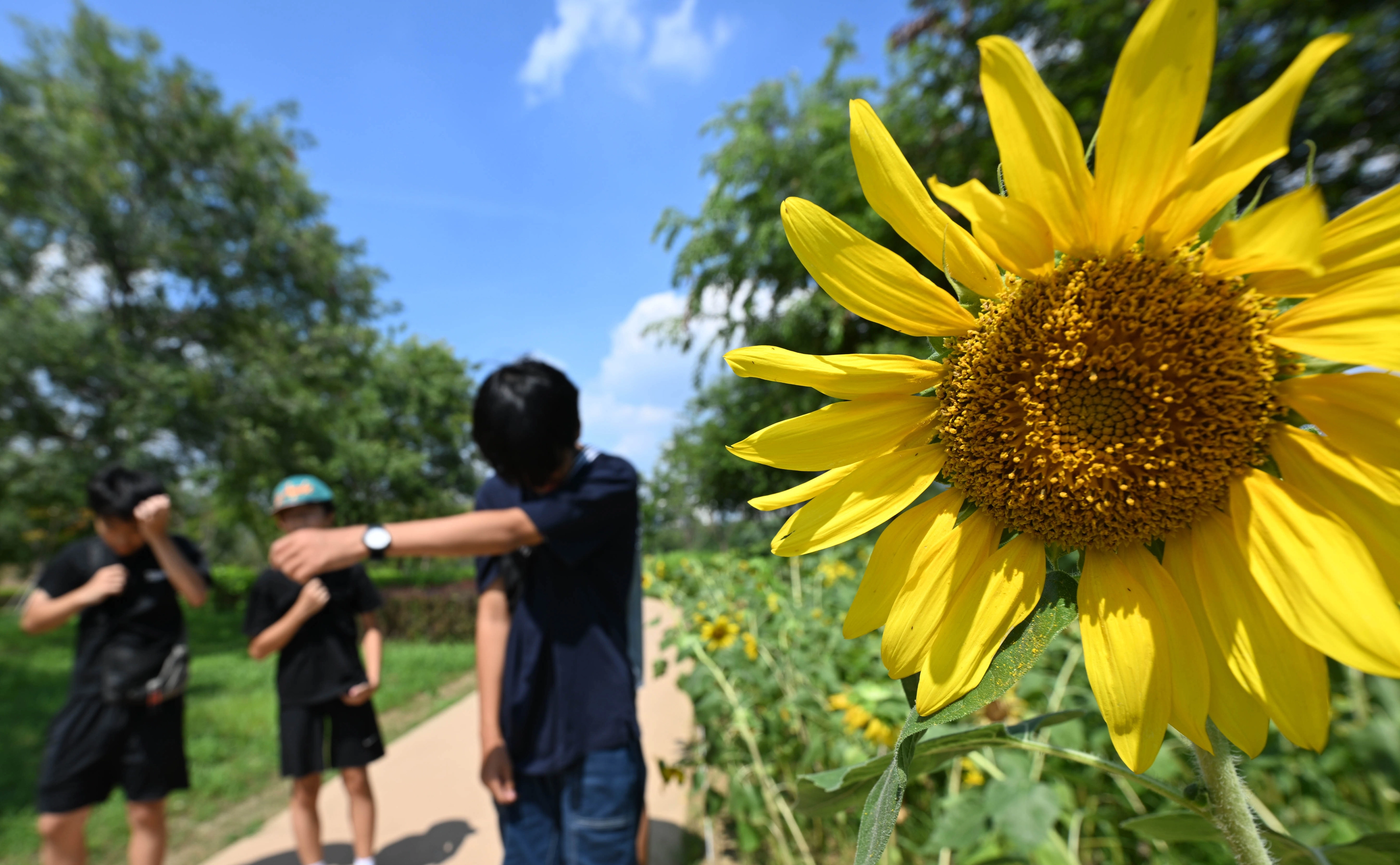 전국 대부분 지역에 폭염특보가 발효된 24일 서울 양천구 안양천공원에서 시민들이 땀을 닦으며 해바라기 꽃밭을 지나고 있다.