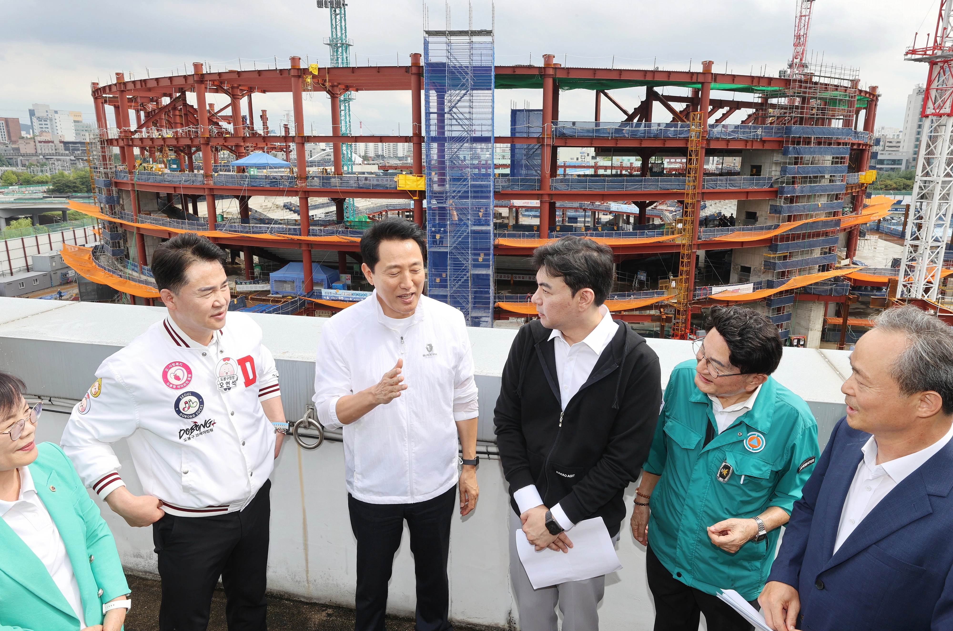 이날 안전모를 눌러쓴 오 시장은 거대한 철골 구조물이 솟아오른 서울아레나 공사 현장을 꼼꼼히 살펴본 후 관계자로부터 진행 상황에 대해 들었다. 현재 건축물의 뼈대를 세우는 골조 공사 중인 서울아레나의 공정률은 이달 기준 34%다. 시 관계자는 “기존 계획 대비 114% 빠른 속도”라고 설명했다.