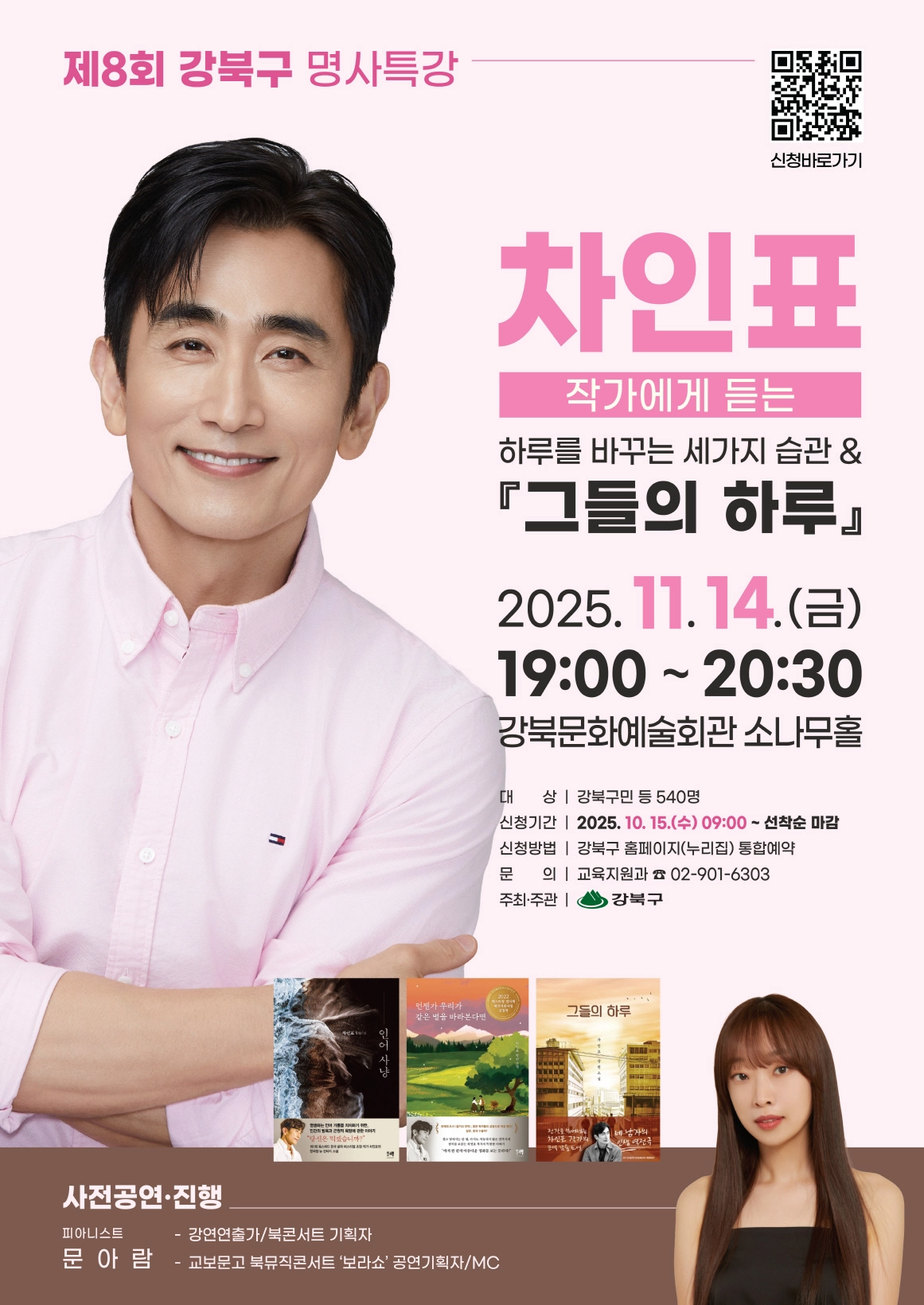 이순희 강북구청장은 “차인표 작가의 강연을 통해 구민이 삶의 의미를 돌아보고 서로에게 건네는 작은 위로의 가치를 되새기는 시간이 되기를 바란다”며 “앞으로도 다양한 분야의 명사들과 함께하는 배움과 소통의 자리를 꾸준히 이어가겠다”고 말했다.