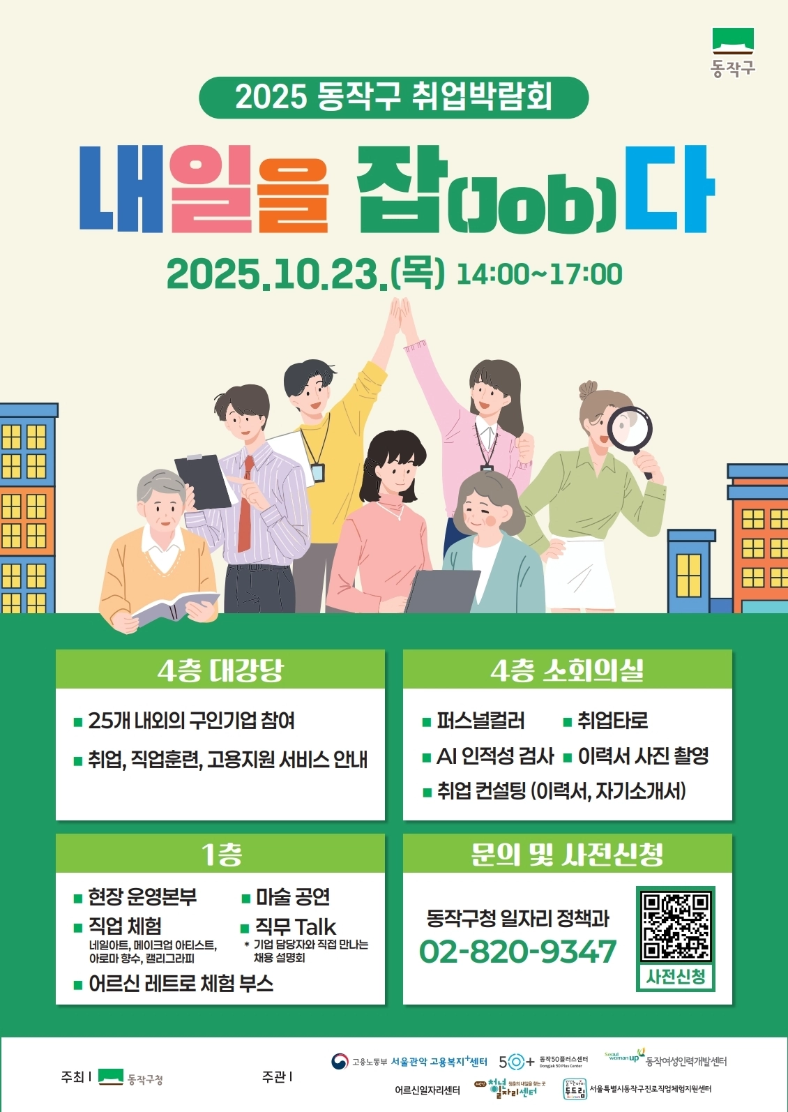 또한 구청을 비롯해 동작취업지원센터, 서울관악고용복지플러스 센터 등 유관기관에서 준비한 ‘홍보부스’에서는 취업·직업훈련·고용지원 정보를 제공한다.