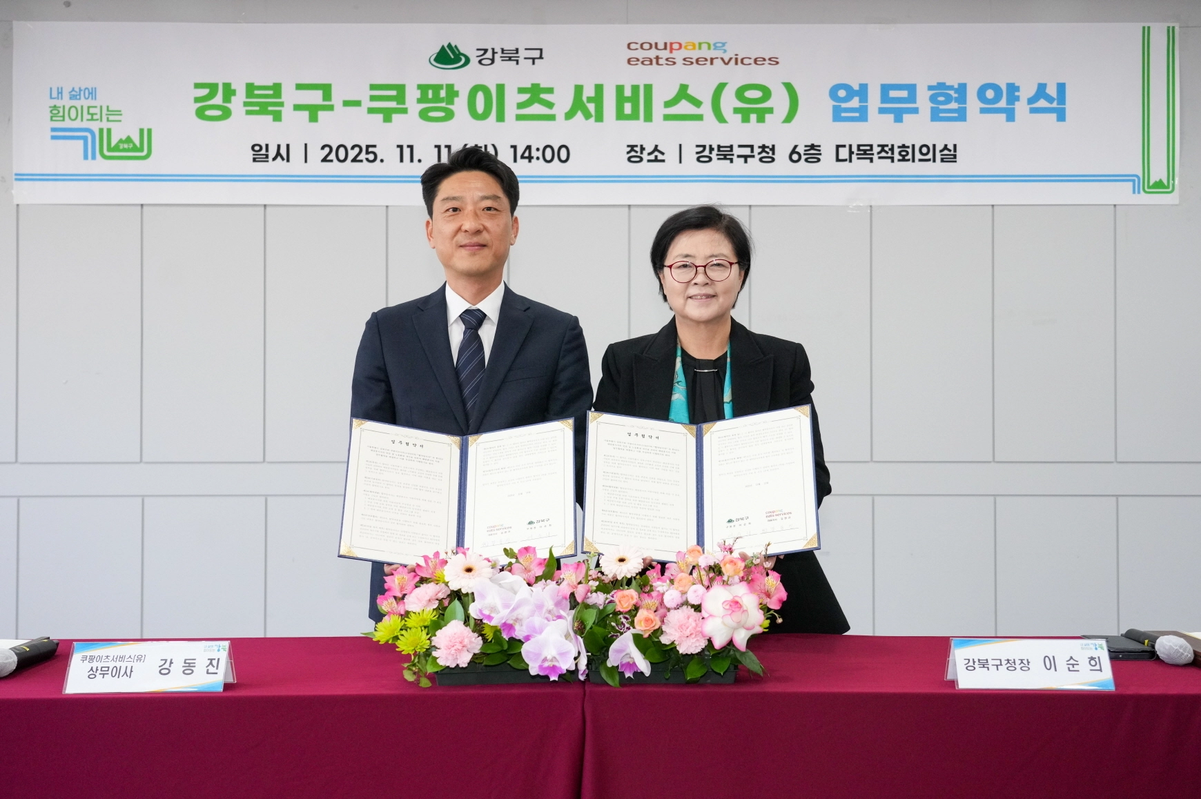 이날 오후 2시에는 구청 다목적회의실에서 구와 쿠팡이츠서비스 간 업무협약식이 열렸다. 협약식에는 이순희 강북구청장과 강동진 쿠팡이츠서비스 상무이사를 비롯한 관계자들이 참석해 민관 상생 협력 의지를 다졌다. 두 기관은 앞으로 2년간 배달 종사자의 안전 확보와 근로 여건 개선을 위한 다양한 지원 사업을 함께 추진할 계획이다.