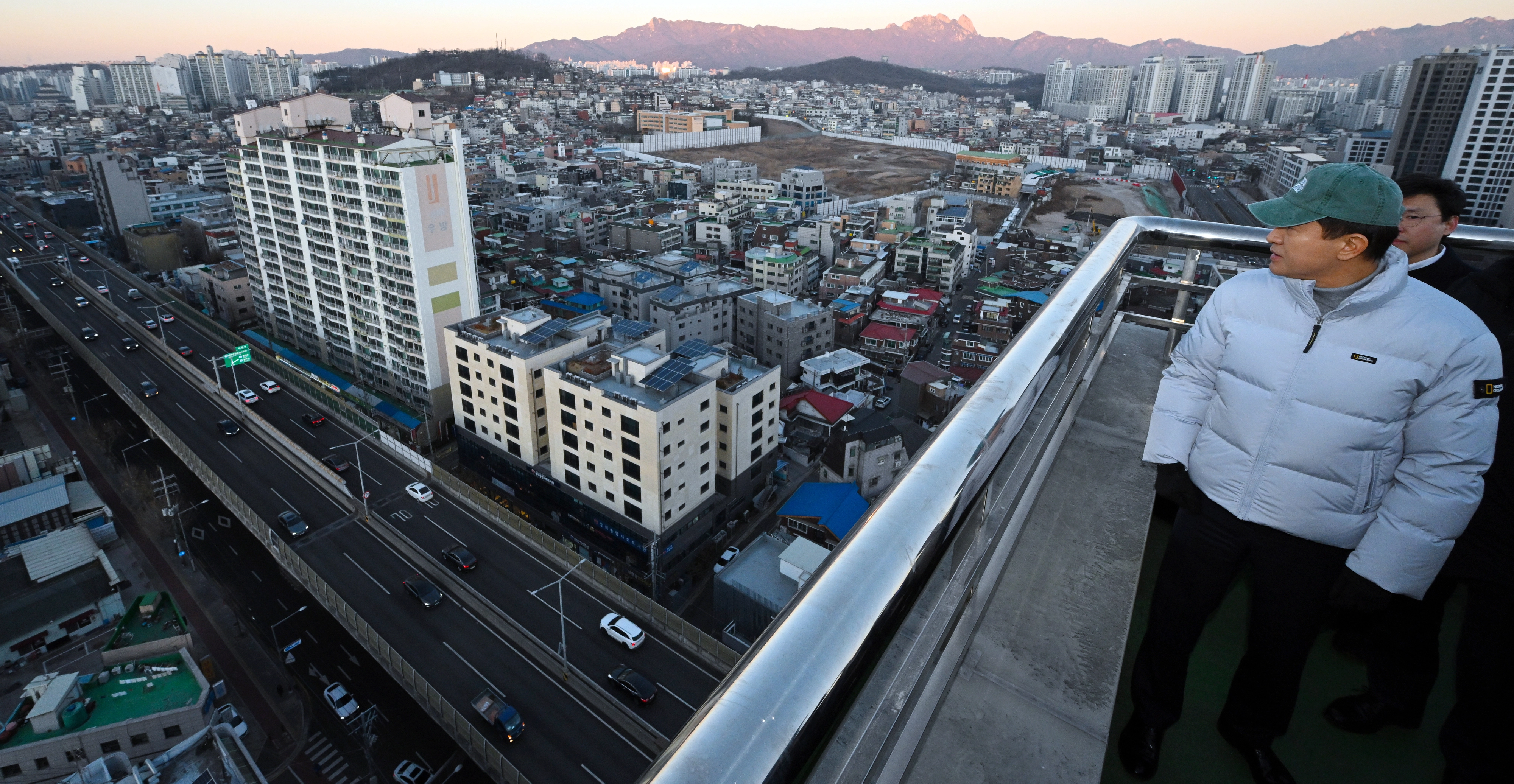 오세훈 서울시장이 22일 ‘강북횡단 지하도시고속도로’ 건설이 예정된 성북구 장위동 돌곶이역 인근 건물 옥상에서 하월곡IC 일대를 둘러보고 있다. 오 시장이 지난 18일 발표한 강북횡단 지하도시고속도로는 내부순환로와 북부간선도로의 약 22㎞ 구간 고가를 철거하고 왕복 6차로 지하도로를 신설하는 대규모 프로젝트다. 오는 2030년 착공해 2037년 지상도로 확충까지 끝내는게 목표다. 뉴스1