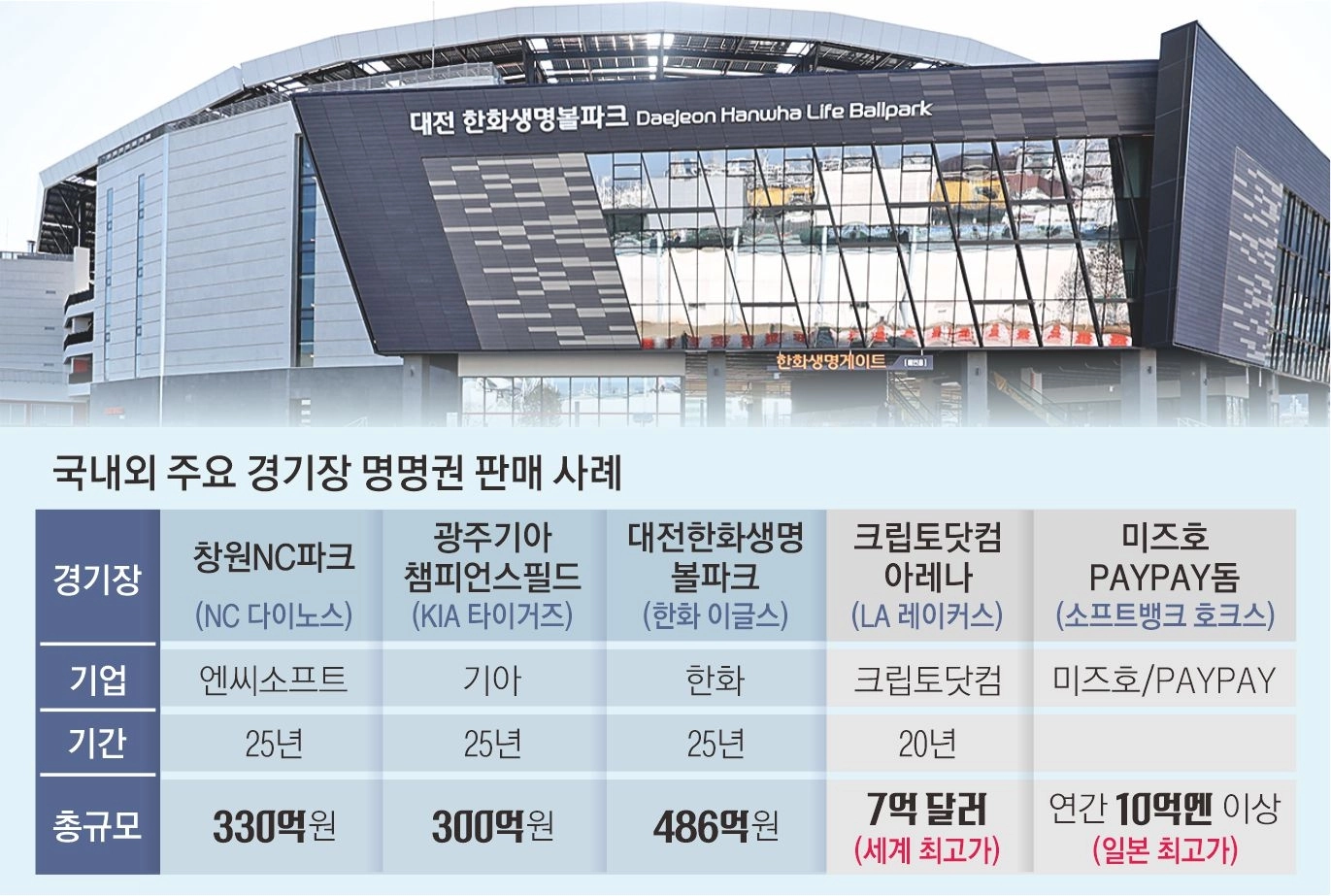 해외에서는 이미 일반화됐다. 2021년 가상화폐거래소 ‘크립토닷컴’에 20년 동안 7억 달러 조건으로 이름을 내준 ‘크립토닷컴 아레나’(NBA LA 레이커스, NHL 로스앤젤레스 킹스의 홈구장)가 대표적이다. 국내도 대전 한화생명 볼파크(25년 486억원)를 비롯해 프로야구 KIA, KT, NC의 홈구장에 연고팀 모기업 이름이 붙었다.