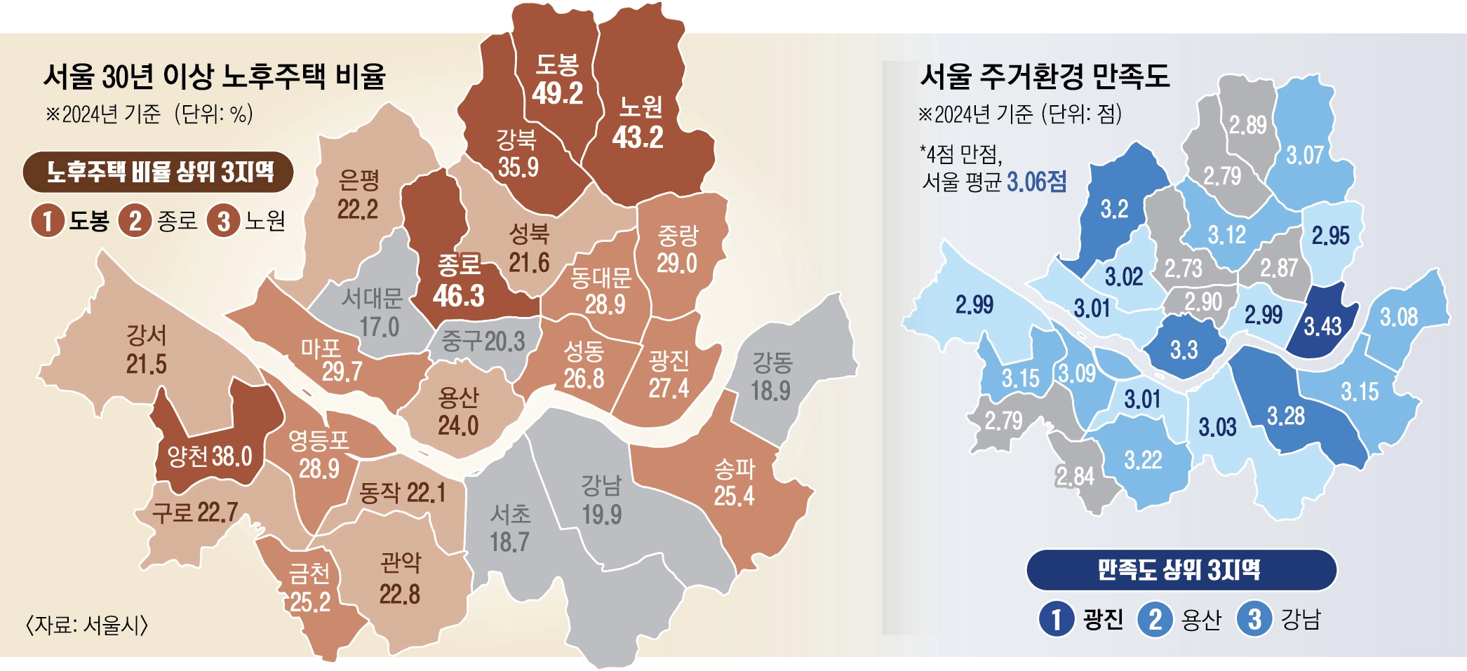 서울의 네 가구 중 한 가구는 지어진 지 30년이 넘은 주택에서 거주하는 것으로 조사됐다. 특히 도봉과 노원, 양천, 강북 등 1980~90년대 아파트 공급이 집중된 지역에 노후 주택이 밀집된 것으로 나타났다. 서울의 자치구 중 주거 환경 및 주택 만족도가 가장 높은 곳은 광진구로 나타났다.