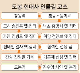 이 길에는 일제강점기에 일본의 핍박을 피해 창동 지역에 살며 제국주의에 저항했던 ‘창동의 세 마리 사자’ 가인 김병로(1887~1964), 고하 송진우(1889~1945), 위당 정인보(1893~1950)와 소설 ‘임꺽정’으로 유명한 벽초 홍명희(1888~1968)의 옛 집터가 있다. 근현대 시인 김수영(1921~1968)의 옛 본가, 민주화 운동가인 함석헌(1901~1989) 가옥과 계훈제(1921~1999) 옛 집터, 민족문화 수호자 간송 전형필(1906~1962) 가옥, 노동운동가 전태일(1948~1970)의 옛 집터도 연결된다.