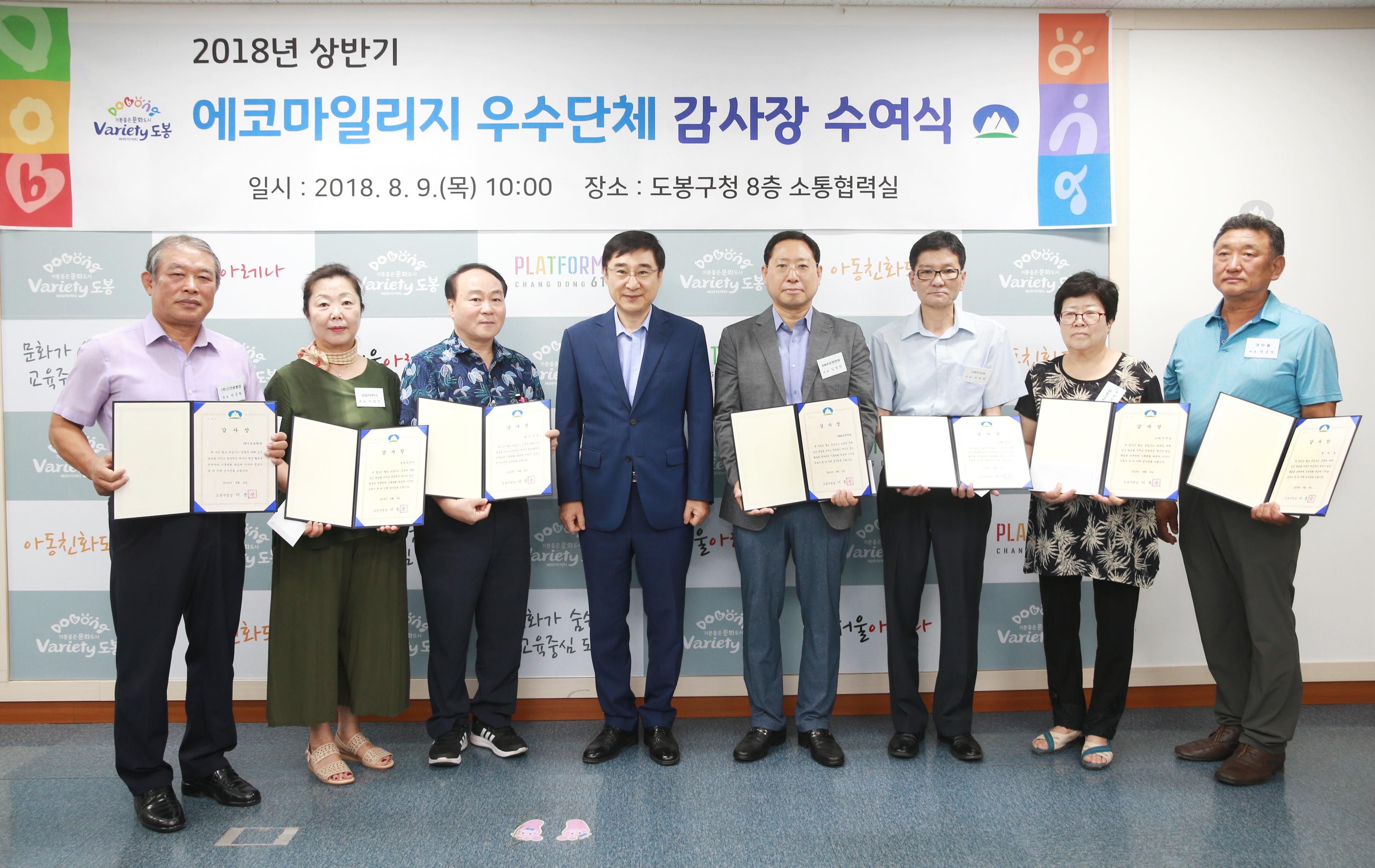 에코마일리지 우수단체 감사장 수여식 지난 9일 서울 도봉구청에서 열린 에코마일리지 우수 단체에 대한 감사장 수여식에서 이동진(왼쪽 네 번째)도봉구청장이 에코마일리지 우수단체 관계자들과 기념 사진을 찍었다.