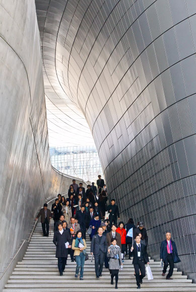 21일 개관한 서울 중구 을지로 동대문디자인플라자(DDP)를 방문객들이 둘러보고 있다. 막대한 건설비와 주변 경관과 다소 동떨어진 우주선 모양의 외관 탓에 논란을 일으킨 DDP는 옛 동대문야구장 자리에 4840억원을 들여 건설됐다. 여성으론 처음 건축계 노벨상인 프리츠커상을 받은 자하 하디드가 3차원 설계를 했고, 크기와 모양이 다른 알루미늄 패널 4만 5133장이 쓰였다.